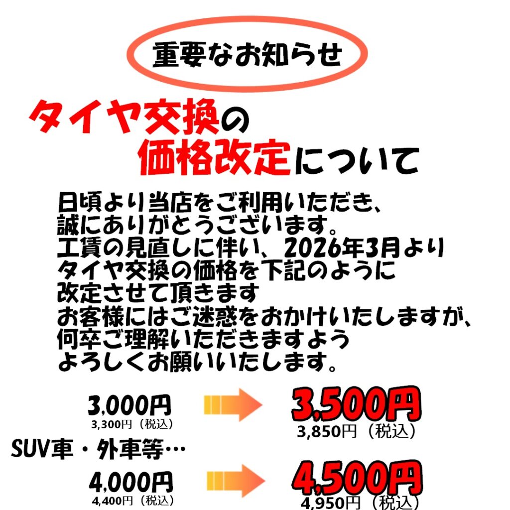 いつも当店をご利用いただき、誠にありがとうございます。 当店では、これまでお客様にご負担をおかけしないよう、可能な限りコスト削減に努め、現行料金を維持してまいりました。しかし諸般の事情により現行価格でのサービス提供が難しくなったため、2025年3月よりタイヤ交換の料金を改定させていただくこととなりました。